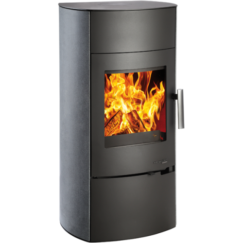 Kamna s obkladem denim blue. Správné nastavení hoření zvládnete díky jednoduchému regulátoru EASY Control, který je v podobě kotouče v dolní části topeniště.
