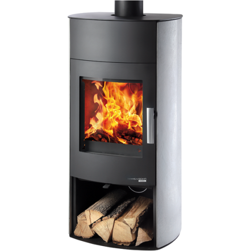 Kamna s obkladem denim blue. Správné nastavení hoření zvládnete díky jednoduchému regulátoru EASY Control, který je v podobě kotouče v dolní části topeniště.